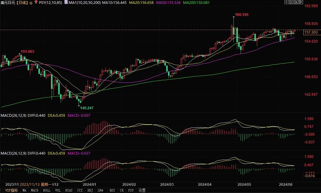 美元兑日元日线图北京时间6月14日9:36,美元兑日元报157.30/31