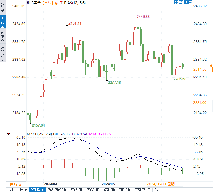 周四(6月13日)欧市时段,现货黄金维持日内跌势,目前金价位于2315美元/盎司附近,日内下跌近10美元。