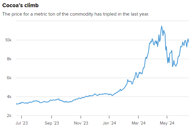 近年来,可可的价格一直徘徊在每公吨2500美元左右。但有关产量低于预期的报道引发了对供应的担忧,引发了近几个月来可可价格的上涨。今年4月,可可价格创下每公吨逾1.1万美元的历史新高。自那以后,价格飙升的势头略有缓和,但仍远高于食品公司习惯支付的价格。