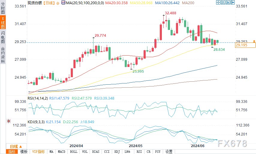 (现货白银日图 来源:易汇通)现货白银继续在上行的50日移动均线29.00美元上找到支撑。这一指标不仅是支撑,而且是潜在加速下行的触发因素。