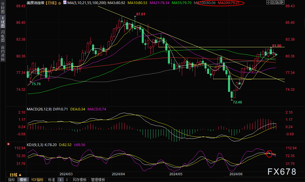 市场的下一个关注焦点将是周五公布的美国个人消费支出(PCE)物价指数,这是美联储首选的通胀指标。投资者希望从中了解经济中的物价压力是否正朝着正确的方向发展。如果数据低于预期,可能会促使投资者加大对今年降息的押注,从而在一定程度上缓解油价面临的压力。本交易日将出炉的美国第一季度国内生产总值(GDP)数据、美国初请失业金人数变动和美国5月耐用品订单月率,投资者需要预约关注。周四美国总统拜登将与共和党总统候选人特朗普之间的重要辩论,投资者也需要留意市场情绪的变化。技术面来看,油价顶破200日均线和80关口并没有加速上涨,KDJ形成死叉,K线高位类似“吞没”看空信号后紧跟带上影线的K线,暗示上方卖压较强,投资者需要警惕震荡顶的可能性。下方分别关注100日均线80.06和200日均线79.21附近支撑。