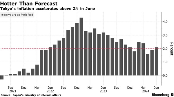 据日本周五发布的数据,6月份东京剔除生鲜食品的核心消费者物价指数(CPI)年率上升2.1%,超出5月的1.9%,也高于市场预期的2%。