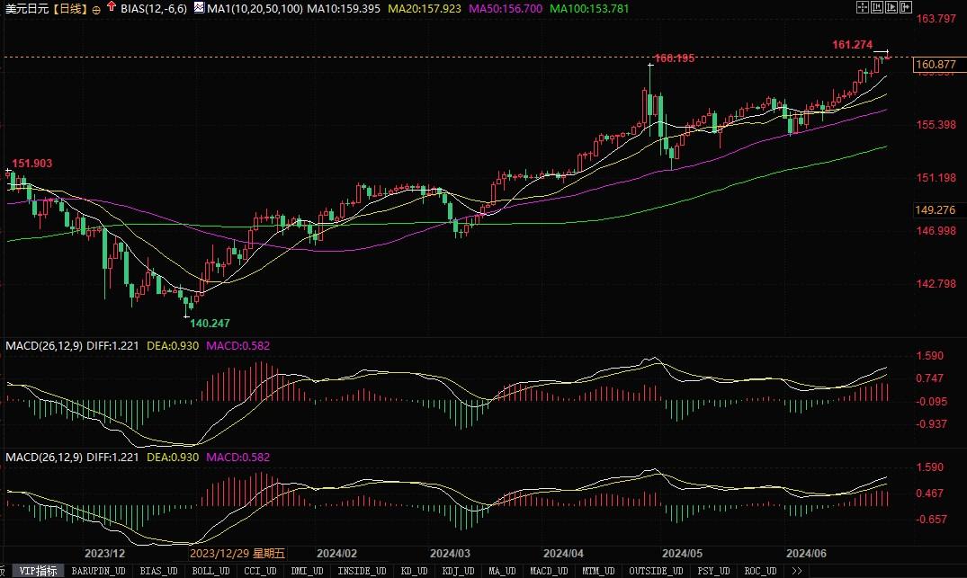美元兑日元日线图北京时间6月28日10:53,美元兑日元报160.87/88