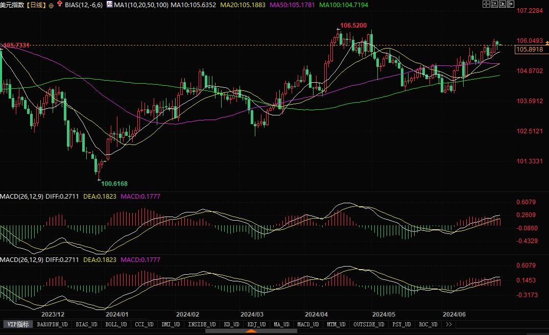 美元指数日线图北京时间6月28日8:34,美元指数报105.89