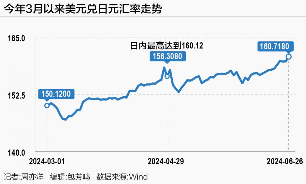 截至6月27日16时30分,日元兑美元汇率徘徊在160.59附近,盘中一度创下过去40年以来的最低点160.86。在此背景下,金融市场对日本当局再度干预汇市“稳汇率”预期骤增。