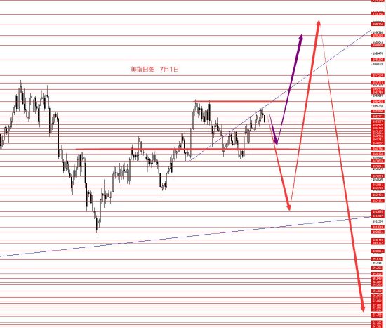 7月1日,美指上周高位震荡,周图收小阳柱。从图形来看,上方106区域压力仍然很重,虽然上周没跌下来,但前个高点106.50直接向上破位也很难,所以本月初框架思路仍是106.10以下继续看空,下方关注105.10和104.40,若能成功跌破104.40再去关注103.20和102.80区域。前期长线框架仍可延用。上周有105.80区域做空的交易单,止损106.30可继续持有,目标105.10和104.40先,下破再看向更低。下方101.70区域仍是下个向上中线波段的转折点,美元大跌前,还有向上一冲。分析仅供参考,风险自负。