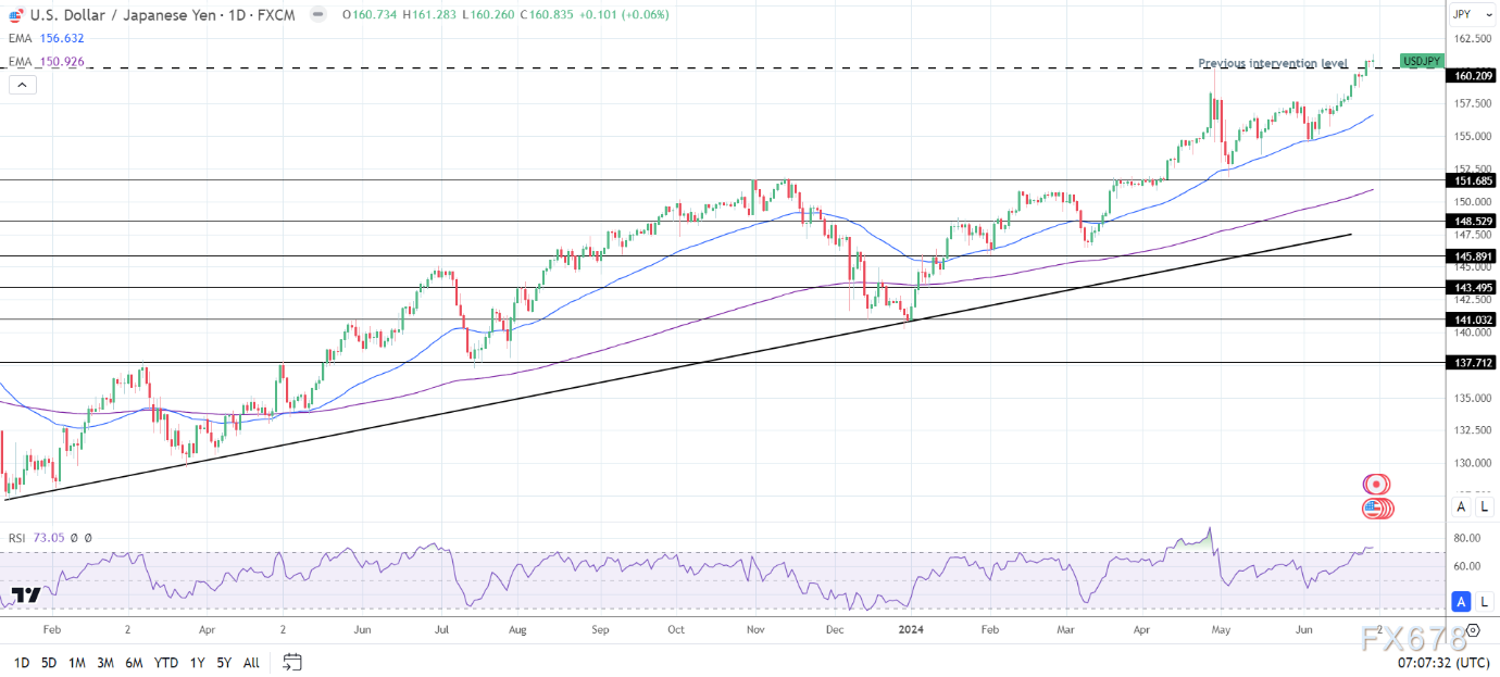 美元/日元若突破6月28日高点161.283,预示着其将向162目标迈进。