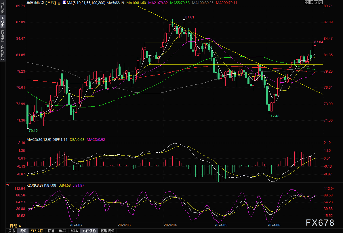 ——周二(7月2日)亚市,国际油价窄幅震荡,美原油目前交投于83.43美元/桶附近。油价周一上涨约2%,触及两个月新高,因市场寄望北半球夏季驾车季节需求会上升,同时担心中东冲突可能蔓延并导致全球石油供应减少。布伦特原油期货周一上涨1.60美元,涨幅1.9%,报收每桶86.60美元;美国原油期货周一上涨1.84美元,涨幅2.3%,报收每桶83.38美元。这是布伦特原油连续第三日创下4月30日以来最高收盘价,也是美国原油自4月26日以来的最高收盘价。