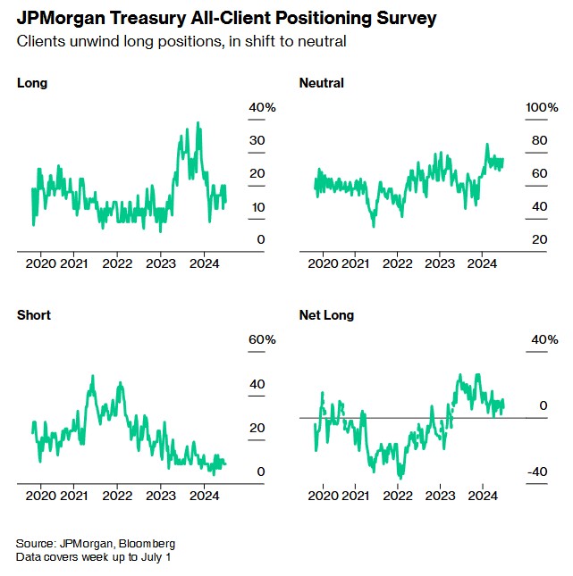 摩根大通的数据显示,现货市场出现了押注美债收益率曲线变陡的势头。该行对客户的最新调查显示,押注美债上涨的头寸减少了5个百分点,净多头头寸降至6月10日以来的最低水平。
