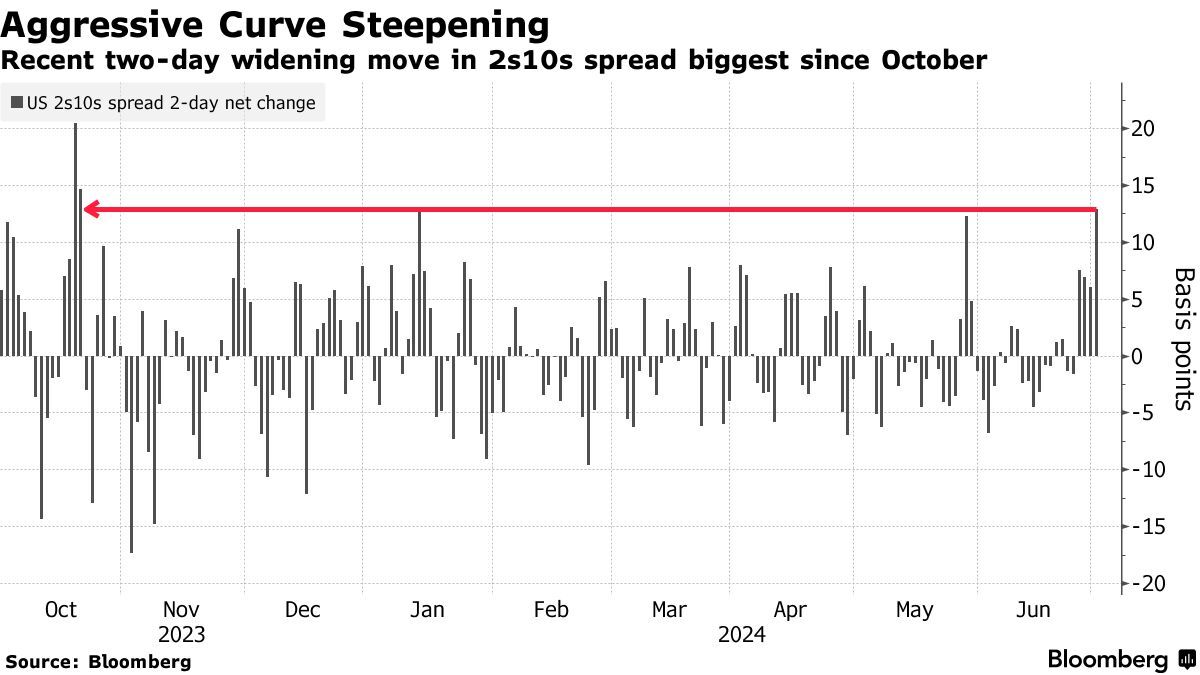 随着华尔街开始为特朗普可能重返白宫做出调整,规模达27万亿美元的美国国债市场的交易员正押注于长期债券收益率走高。在第一场美国总统选举辩论之后,交易员一直在购买期限较短的美债,并出售期限较长的美债。这种押注美债收益率曲线变陡的势头在第一场辩论之后便一直在加强。数据显示,两年期和十年期美债收益率差在上周五和本周一陡升约13个基点,为去年十月以来的最大两天幅度。