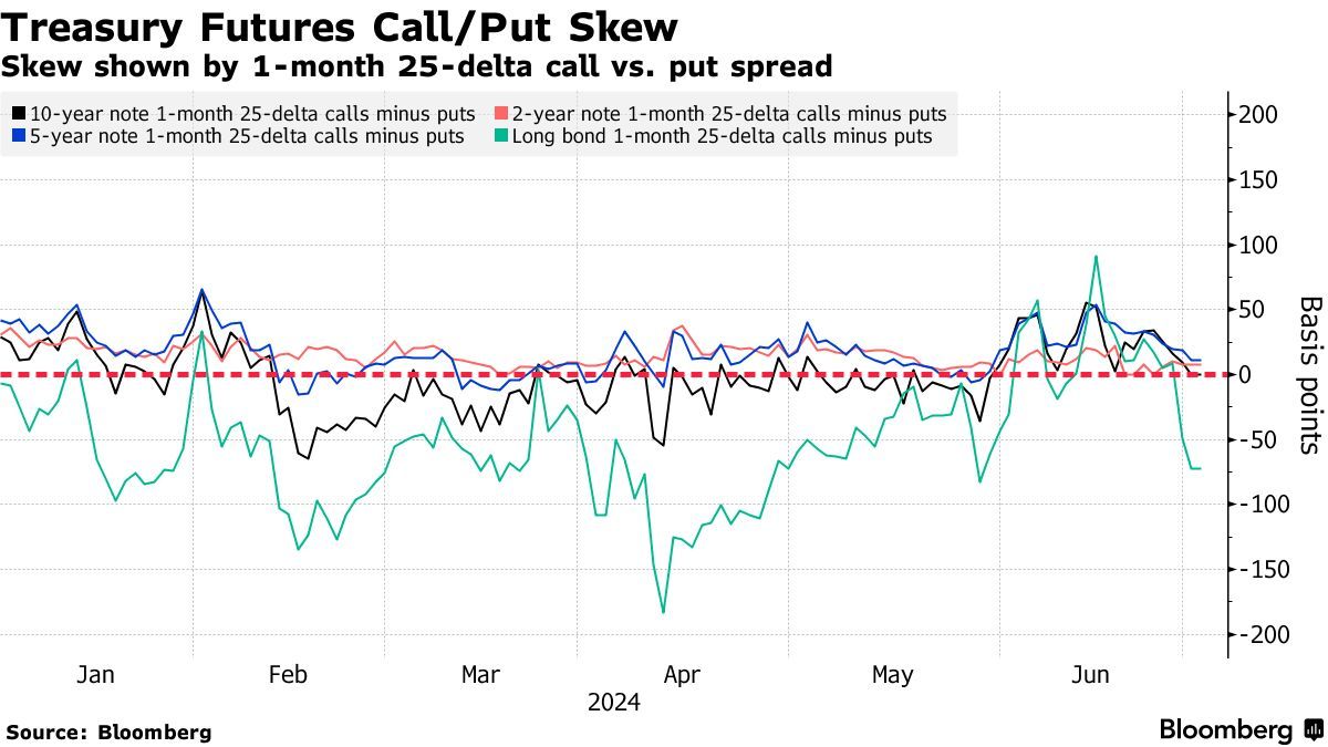 为对冲收益率曲线长端风险而支付的溢价已从看涨转为看跌。自5月底以来,就在三十年期美债收益率达到4.65%以上的峰值时,交易员们正支付最高价格来对冲长期国债的抛售。过去一周最引人注目的是空头仓位,目标是十年期美债收益率在8月23日时达到4.55%的高位。