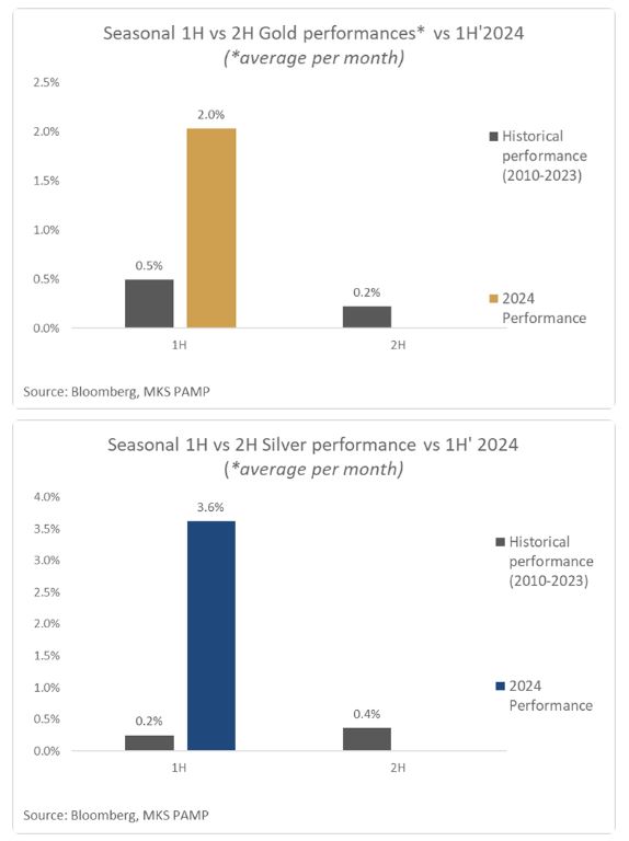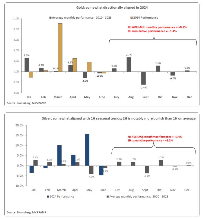 他们指出:“2024年上半年黄金和白银的表现遵循了历史季节性价格表现标准;它们在应该上涨的时候上涨,黄金2024年上半年平均每月涨幅为2%,白银每月涨幅为3.6%。”“显著的季节性表现是由于1)各国央行和亚洲基础建设(黄金)和2)对通胀/战争/地缘政治/去美元化风险的担忧压倒了高通量美联储加息和美元走强(黄金、白银)。”
