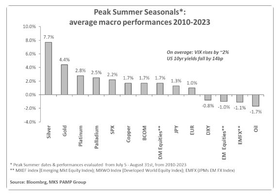 他们表示:“从7月4日到劳动节,贵金属在夏末通常表现强劲,白银(+7.7%)和黄金(+4.4%)表现强劲,因为宏观投资者从主流资产中撤退。”“黄金/白银的这种季节性强势可以部分归因于过去围绕杰克逊霍尔的鸽派预期、2011年欧洲危机和COVID货币应对措施(导致7月/8月左右的数据出现偏差),以及在9月季节性实物需求回升之前的先发制人购买。新兴市场资产(从EMFX到股票)传统上在这个夏季高峰期面临阻力。”