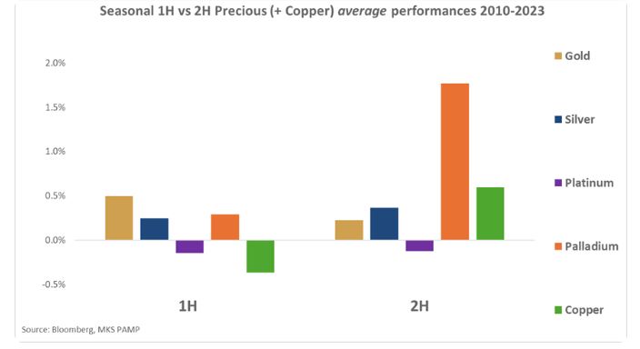 他们表示,从历史上看,黄金、白银、铂金、钯金和铜的下半年表现比上半年平均要好,“下半年金属的平均表现比上半年金属的平均表现高出6倍(数据在很大程度上受到2010年以来钯金在下半年表现优异的推动)。”