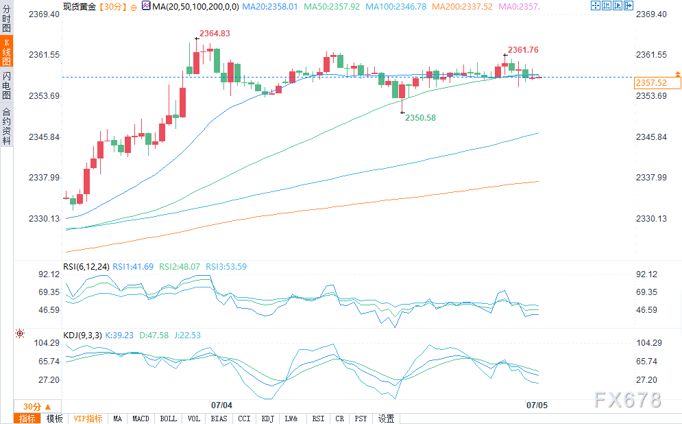 周四(7月4日)美市盘中,黄金维持上涨,盘中报2357.42美元,涨幅0.06%,盘中最高触及2362美元。此前美国公布了一系列疲软的数据,美联储主席鲍威尔的语气也发生了变化,增加了人们对美联储将比之前预期更早降息的押注。