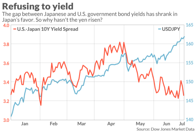 自4月下旬以来,10年期美债收益率与10年期日债收益率之间的利差已明显收窄,从4月25日的3.817%的年内高点下降到周三的3.256%。按照传统逻辑,这本应足以阻止甚至逆转日元对美元的贬值趋势。