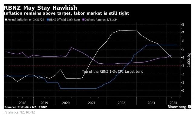 图:新西兰联储可能保持鹰派(通胀仍高于目标,劳动力市场仍紧张)(白线:年度通胀,蓝线:官方现金利率,紫线:失业率,虚线:1%至3%CPI目标区间上限)