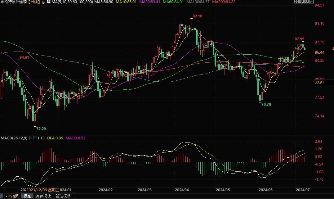 布伦特原油日线图北京时间7月8日9:00,布伦特原油报86.43美元/桶