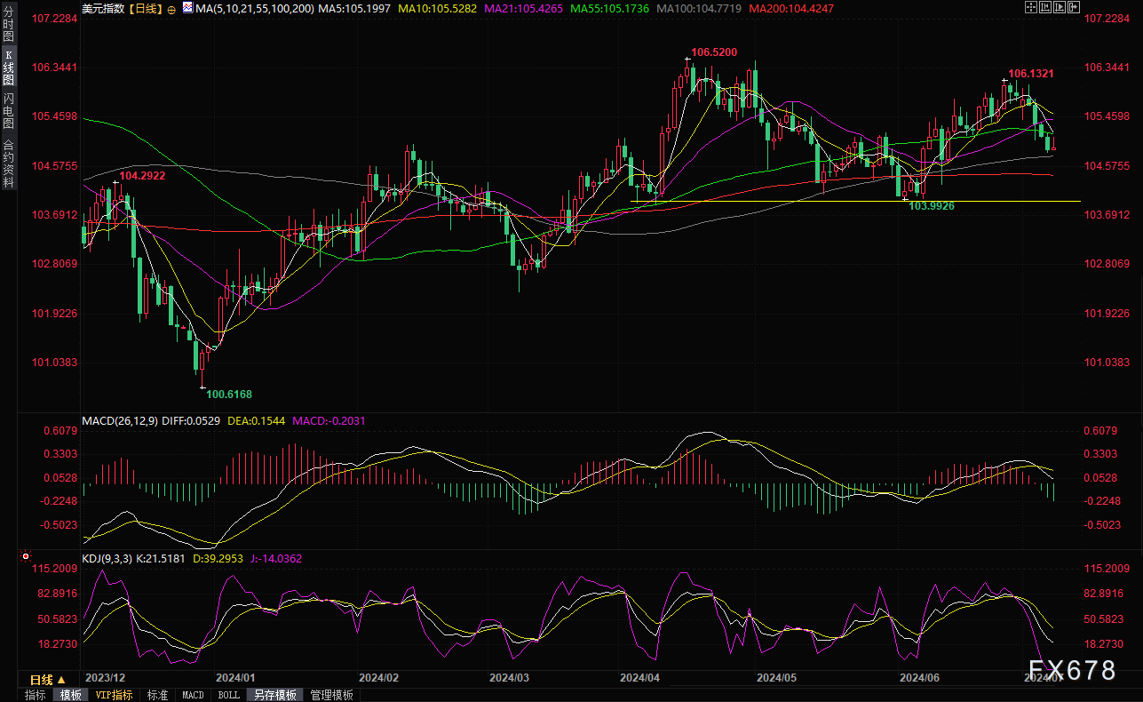 美元指数上周五下跌0.25%,收报104.88,为连续四个交易日下跌,此前公布的数据显示美国6月就业增长略有放缓,同时失业率上升,这增强了美联储可能在9月开始降息的观点。