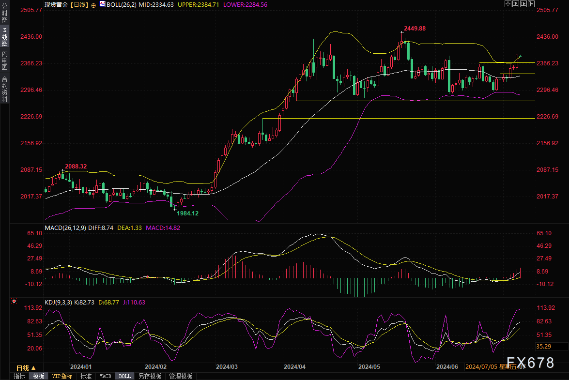 日线图来看,金价上周五顶破了6月21日高点2368.62关键位置,布林线水平运行后开口,MACD金叉运行,KDJ金叉运行,金价后市有望沿布林线上轨向上运行,初步阻力参考2400关口,5月21日高点阻力在2406.01附近,然后是2420关口和历史高点2450关口附近阻力。