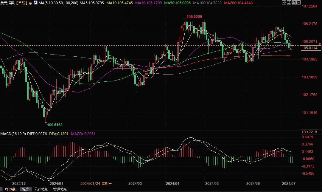 美元指数日线图北京时间7月9日9:26,美元指数报105.00
