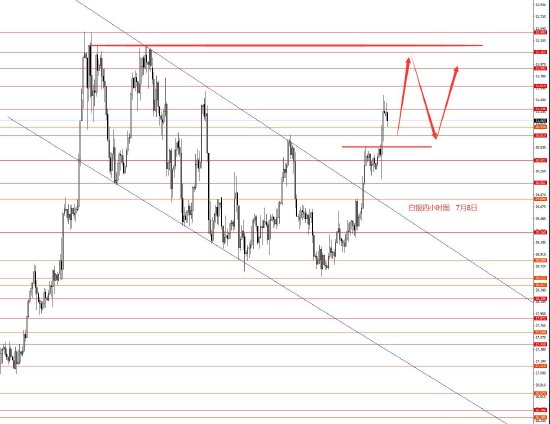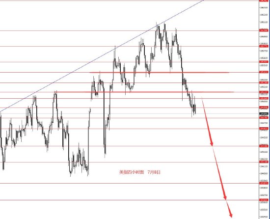7月8日,美指上周正如预期下行,周图收阴柱。从图形来看,本周继续下行的概率较大些,上方关注105.40强阻力,以下继续看空,理想建仓价在105.30附近,但不一定能给到,也有可能一直在105.15下方震荡后直接下跌。本周操作策略:105.25附近做空,止损105.80,目标看向104.40和103.60,再看向103.20和102.80,波段极限101.70附近。前两周的波段空单下移止损可继续持有。控制仓量,严格止损。