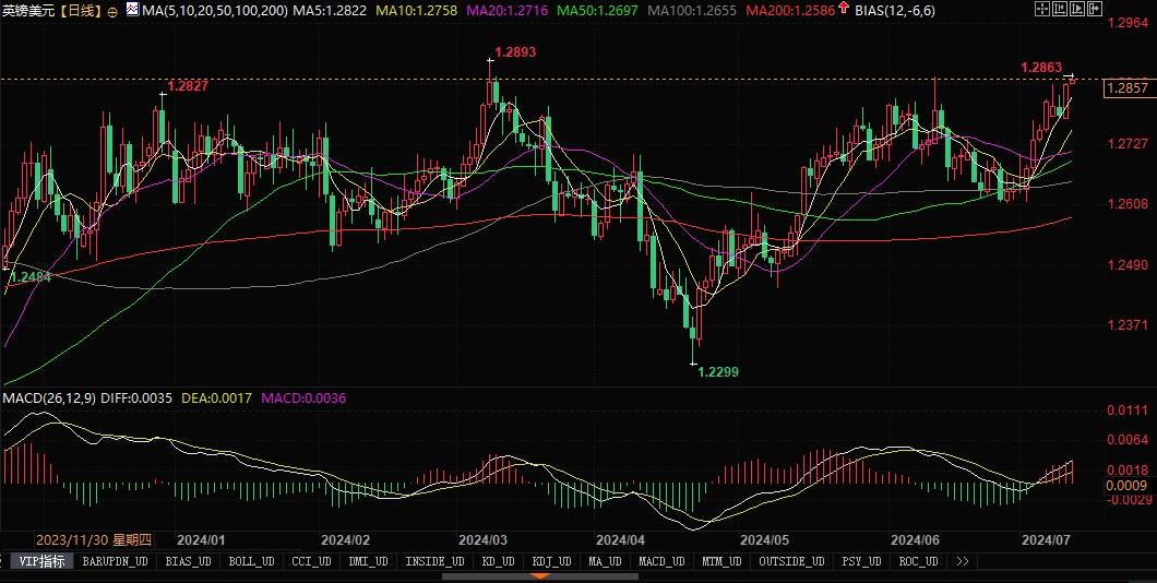 英镑兑美元日线图北京时间7月11日13:34,英镑兑美元报1.2857/59
