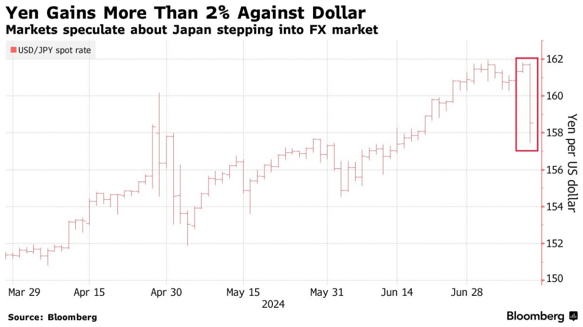 在美国经济数据公布后的几分钟内,日元兑美元一度上涨 4 日元,至 1 美元兑 157.44 日元,交易量的激增让人想起了日本当局过去的干预行动。