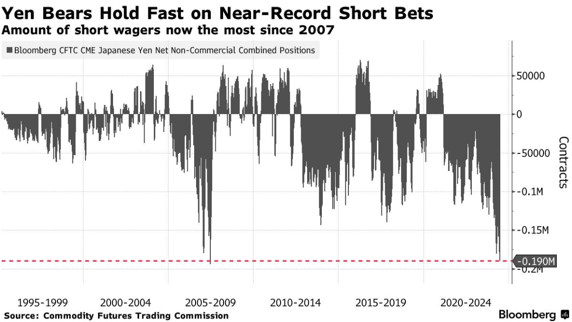 投机交易员已经积累了大量看跌日元的押注。根据美国商品期货交易委员会截至 7 月 2 日当周的数据,非商业交易员目前持有约 189,560 份押注日元将在未来几周下跌的合约(价值约 147 亿美元),这是自 2007 年以来最多的。