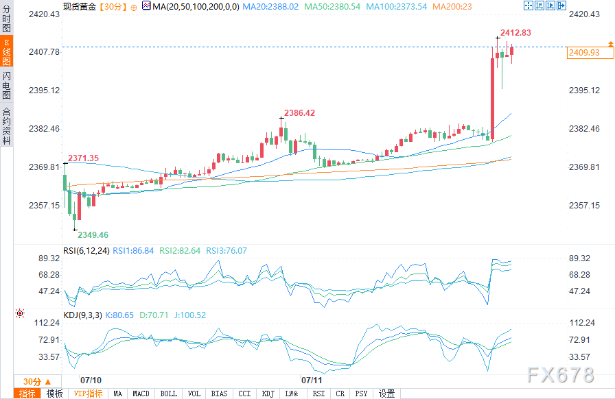 现货黄金突破2410美元/盎司,自CPI公布后累涨逾30美元。