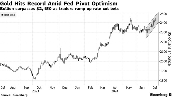周二(7月16日),尽管美元基本持稳,但黄金市场却出现“惊人行情”,现货黄金单日暴涨近47美元,最高触及2469.55美元/盎司,周三亚市一举刷新历史高点至2472.94美元/盎司。