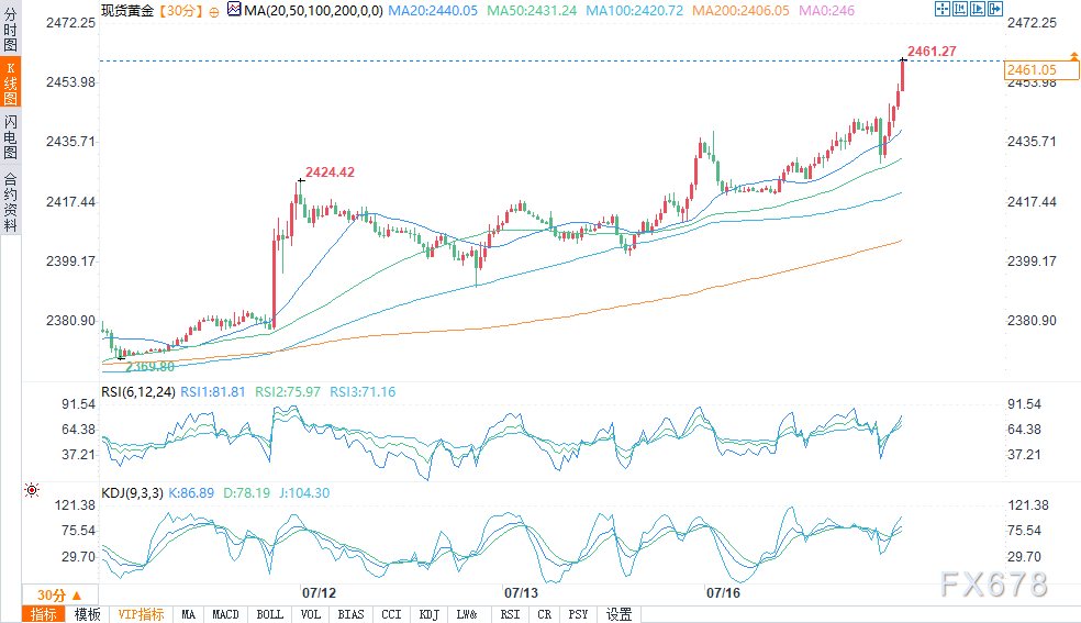 周二(7月16日)美国早盘,黄金价格走高,盘中报创下新高,盘中报2460.92美元/盎司,涨幅1.60%。多头势头强劲,将黄金推向历史新高。技术性买盘和美国即将降息的想法目前助长了贵金属多头。
