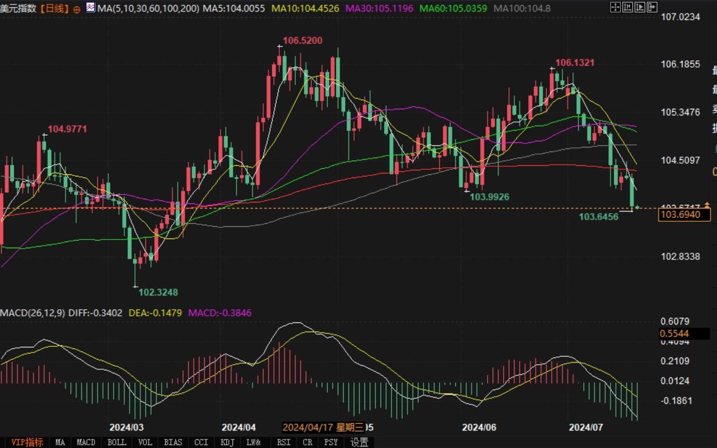 美元指数日线图北京时间7月18日7:14,美元指数报103.69