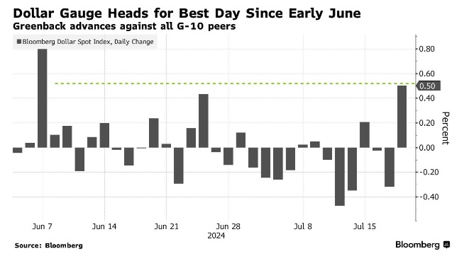 彭博美元现货指数(Bloomberg Dollar Spot Index)周四一度大涨0.5%,创下6月初以来最大单日涨幅,这令该指数有望三周以来首次周线上涨。
