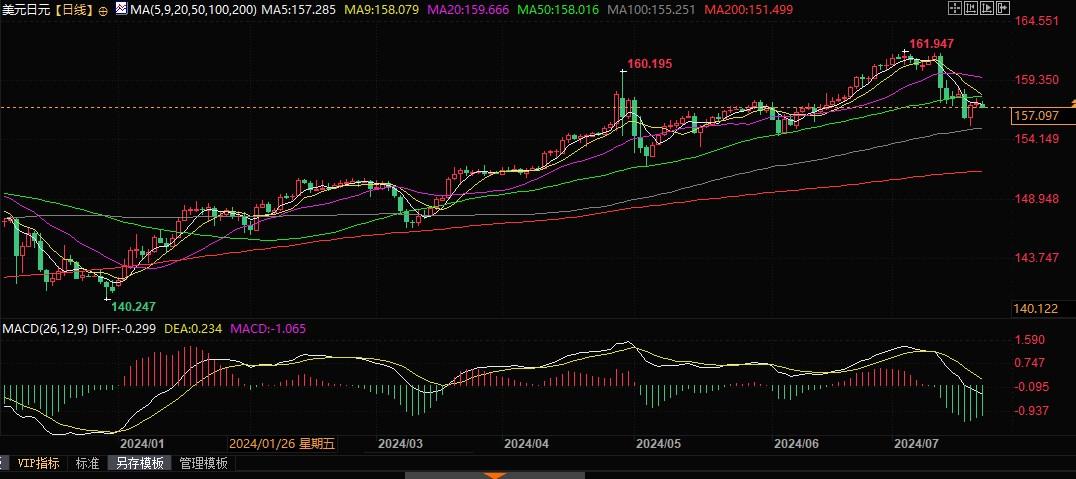 美元兑日元日线图北京时间7月22日14:04,美元兑日元报157.09/10