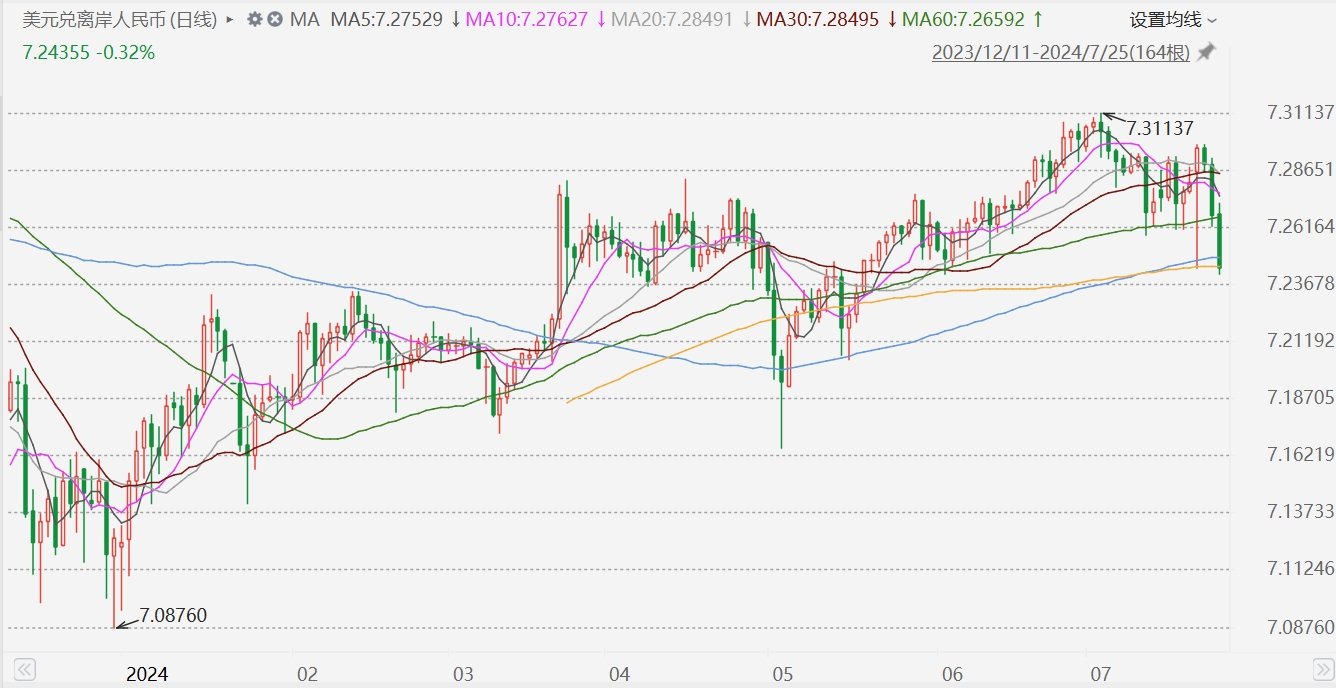 格隆汇7月25日|人民币走强,离岸人民币兑美元涨幅一度扩大至0.3%,报7.2411,创6月份以来最高水平。