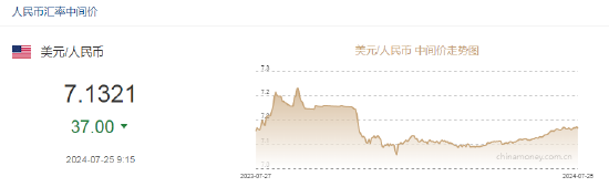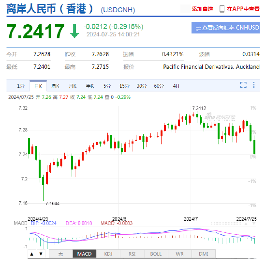 7月25日,离岸人民币兑美元涨幅一度扩大至0.3%,升破7.24,创6月份以来最高水平。