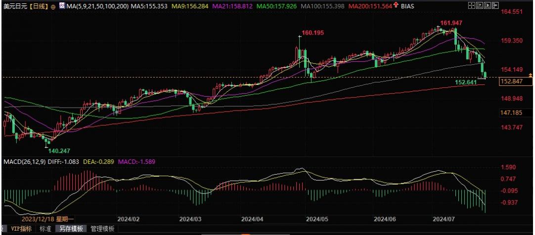美元兑日元日线图北京时间7月25日10:35,美元兑日元报152.81/82