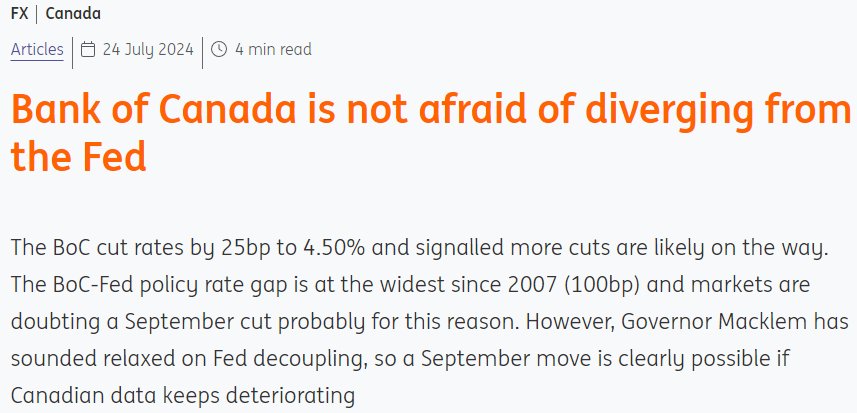 加拿大央行将利率下调25个基点至4.50%,并暗示可能进一步降息,成为七国集团(G7)中第一个下调利率的经济体,导致其与美联储政策利率差距达到2007年以来的最大水平。荷兰国际集团(ING)展望美联储9月降息,但美国债市剧烈波动证明,美联储下周降息的定价深化,鸽派可能在7月提前到来。