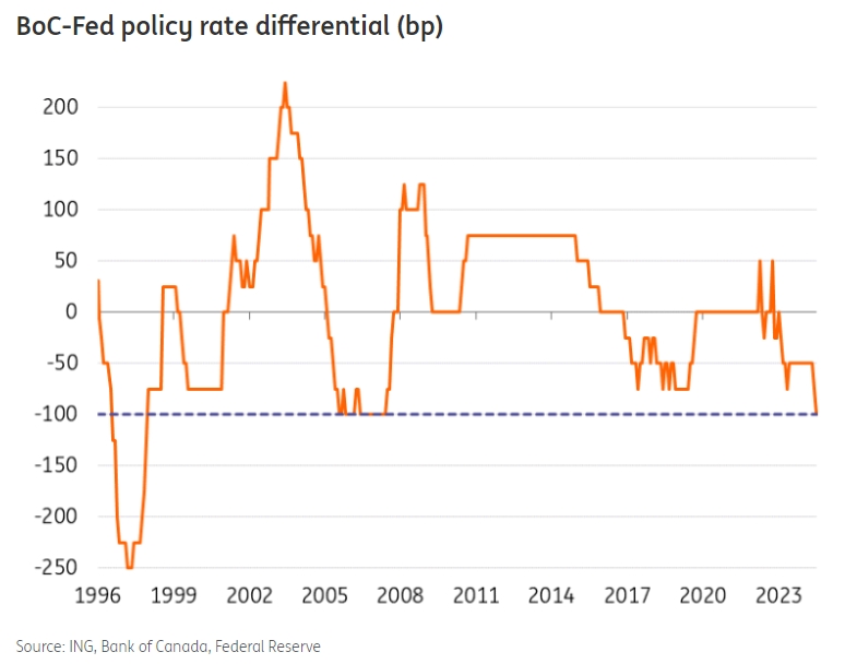 一些分析师称,当前呼吁维持利率不变的一个担忧是加拿大央行和美联储之间的利率差距不断扩大,目前差距为-100个基点。这是自2007年以来最大的负差额,如果加拿大央行在美联储之前再次降息,那么差距将是25年来最大的。但是,这真的是加拿大央行的担忧吗?