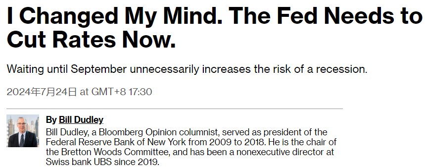 “事实已经改变,所以我也改变了主意。美联储应该降息,最好是在下周的政策制定会议上,”杜德利在美联储7月30至31日政策会议前的彭博社专栏文章中表示。