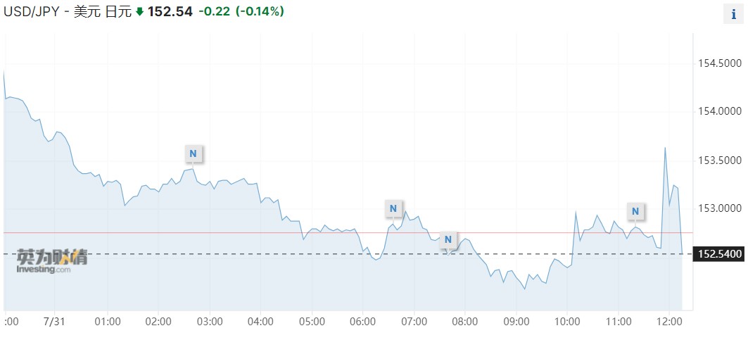 日本央行的渐进做法与美联储2022年的快速紧缩形成了对比,后者在2022年至2023年期间将政策利率提高了5.25个百分点。巨大的利差导致资金从日本流向美国,导致日元持续下跌;日元兑美元汇率本月接近162,创37年新低,自2022年初以来下跌了近30%。消息发布后,日元汇率短线剧烈震荡走高,美元兑日元目前跌破153,稍早一度快速跌破152关口。