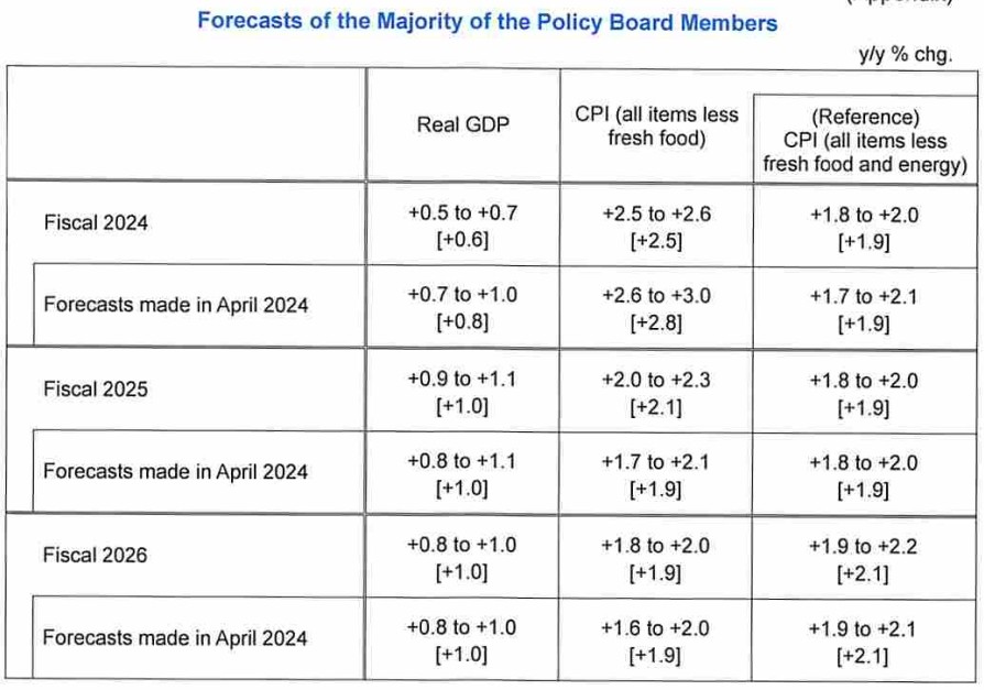 然而,日本央行还下调了今年经济增速预测通胀预测。日本央行预计,2024财年实际GDP增速预期中值为0.6%(4月份预期为0.8%);2024财年除去食物的核心CPI预期中值为2.5%(4月份预期为2.8%)。而2025财年实际GDP增速预期中值、除去食物与能源的核心CPI预期中值较4月份的预测维持不变,分别为1.0%、1.9%。此外,日本央行预计,2026财年实际GDP增速预期中值为1.0%,2026财年核心CPI预期中值为1.9%。