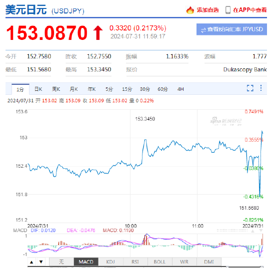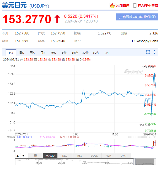 7月31日,日本央行加息15个基点,将政策利率上调至0.15%-0.25%,市场预期维持不变。此次加息为今年3月解除负利率政策以来的首次加息。美元兑日元短线小幅拉升。