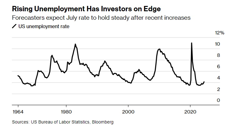 与此同时,美国7月失业率预计将保持在4.1%,为2021年11月以来的最高水平,此前三个月失业率都在上升。