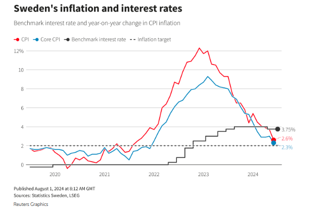 瑞典央行在5月份结束了长期的货币紧缩政策,进行了本轮周期的首次降息,并准备在通胀降温和经济大幅萎缩后再降息两到三次。瑞典的基准利率目前为3.75%,与6月份1.3%的CPI(按照欧盟统一标准折算)涨幅相比,显得有些偏高。