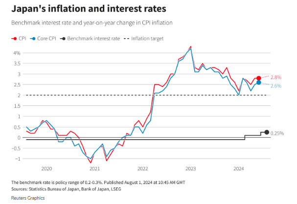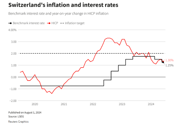 瑞士央行今年3月率先在发达市场经济体中实施了本轮周期的首次降息,6月再度出手将借贷成本降至1.25%,当前市场预计9月将再次降息。瑞士通胀率同比已降至1.3%,稳居瑞士央行目标区间之内。