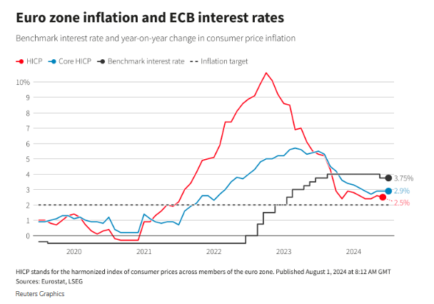 欧洲央行在6月份首次降息之后,上个月维持存款机制利率不变,并拒绝讨论下一步举措。总体而言,欧元区通胀率已降至了接近欧洲央行的2%目标附近。但服务业价格压力仍令部分决策者保持谨慎。利率市场目前预计欧洲央行9月份再次降息的可能性约为70%。