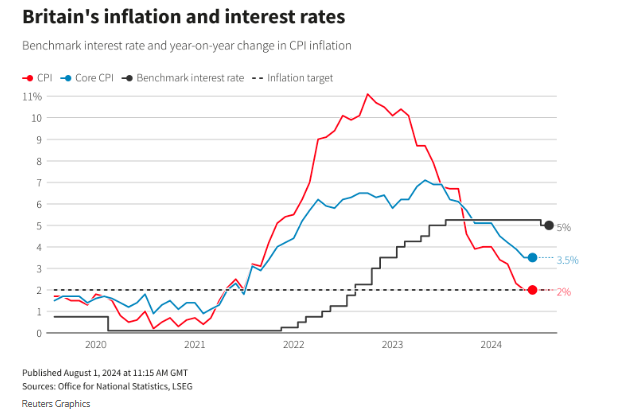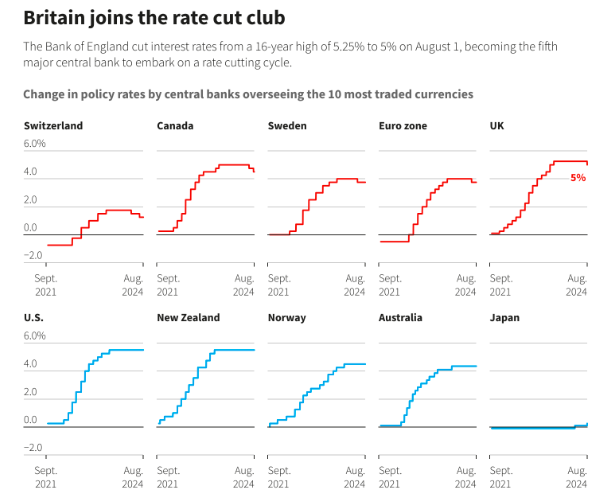 英国央行周四宣布降息25个基点至5.00%,这是自2020年3月以来的首次降息。英国央行决策者们对通胀压力是否已充分缓解存在分歧5比4的决议投票赞成比,也凸显了他们内部的纠结。英国央行行长安德鲁·贝利表示,英国央行货币政策委员会未来将谨慎行事。