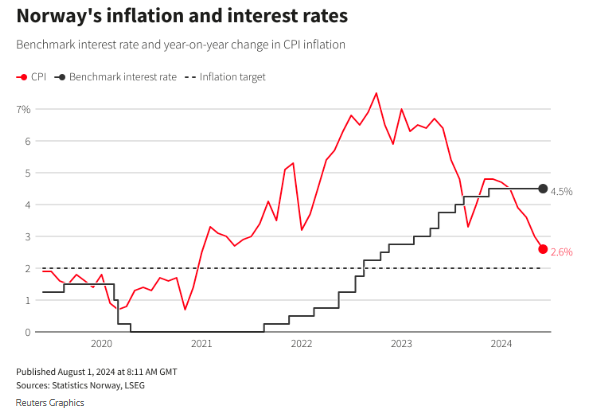 挪威6月份剔除能源价格和税收因素的核心通胀率增幅同比回落至了3.6%,降幅快于预期。不过对于挪威央行来说,这一水平仍然高得令人不安,该央行预计将维持利率在16年来的最高水平4.50%直到2025年初,尽管目前利率期货市场预计12月份降息的可能性约为50%。